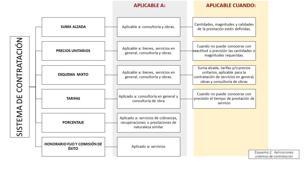 La aplicación de cada sistema de contratación depende de las características y naturaleza propia del objeto a contratar, por ejemplo en el sector de la construcción el sistema de contratación suma alzada tiende a tener mayor uso en edificaciones y la contratación por precios unitarios se utiliza principalmente en obras relacionadas a vías y movimientos de tierra.